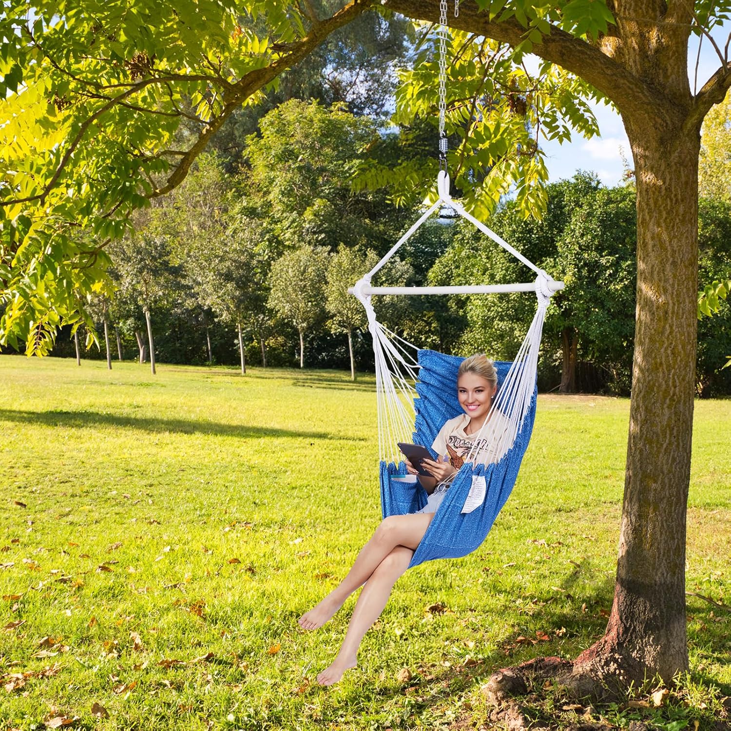 Transform your outdoor or indoor space into a cozy retreat with the Backyard Expressions Hanging Hammock Chair Swing. Designed for comfort, durability, and style, this hammock chair supports up to 500 lbs and includes everything you need to hang it safely—from the stainless-steel chain and hooks to the anti-slip bar and plush pillows. Crafted from a breathable, high-quality cotton blend fabric, this swing chair offers the perfect mix of softness and strength. The double-stitched edges and reinforced hanging ropes ensure safety and stability, while the adjustable hanging system allows you to find the ideal height for any space. Whether you’re lounging on your porch, patio, garden, or indoors, this hammock chair makes it easy to unwind. Choose from five stylish color options—Grey, Beige, Green, Blue, or Teal—to match your personal taste and décor. Relax, read, or simply enjoy the breeze—Backyard Expressions helps you create your perfect backyard escape.